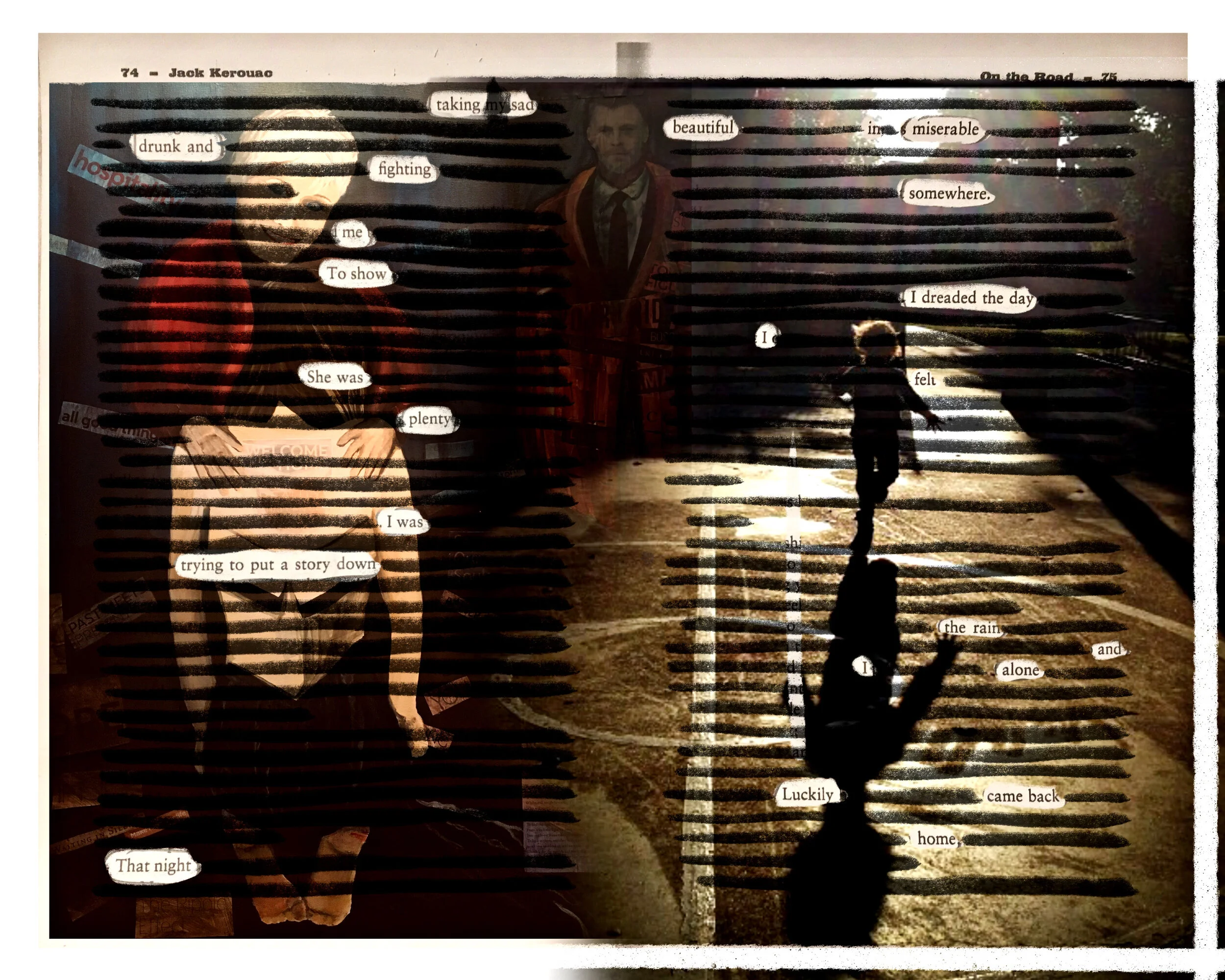 Digital collage with acrylic painting, photo, and blackout poetry from page 74 and 75 of Jack Kerouac’s, On the Road.