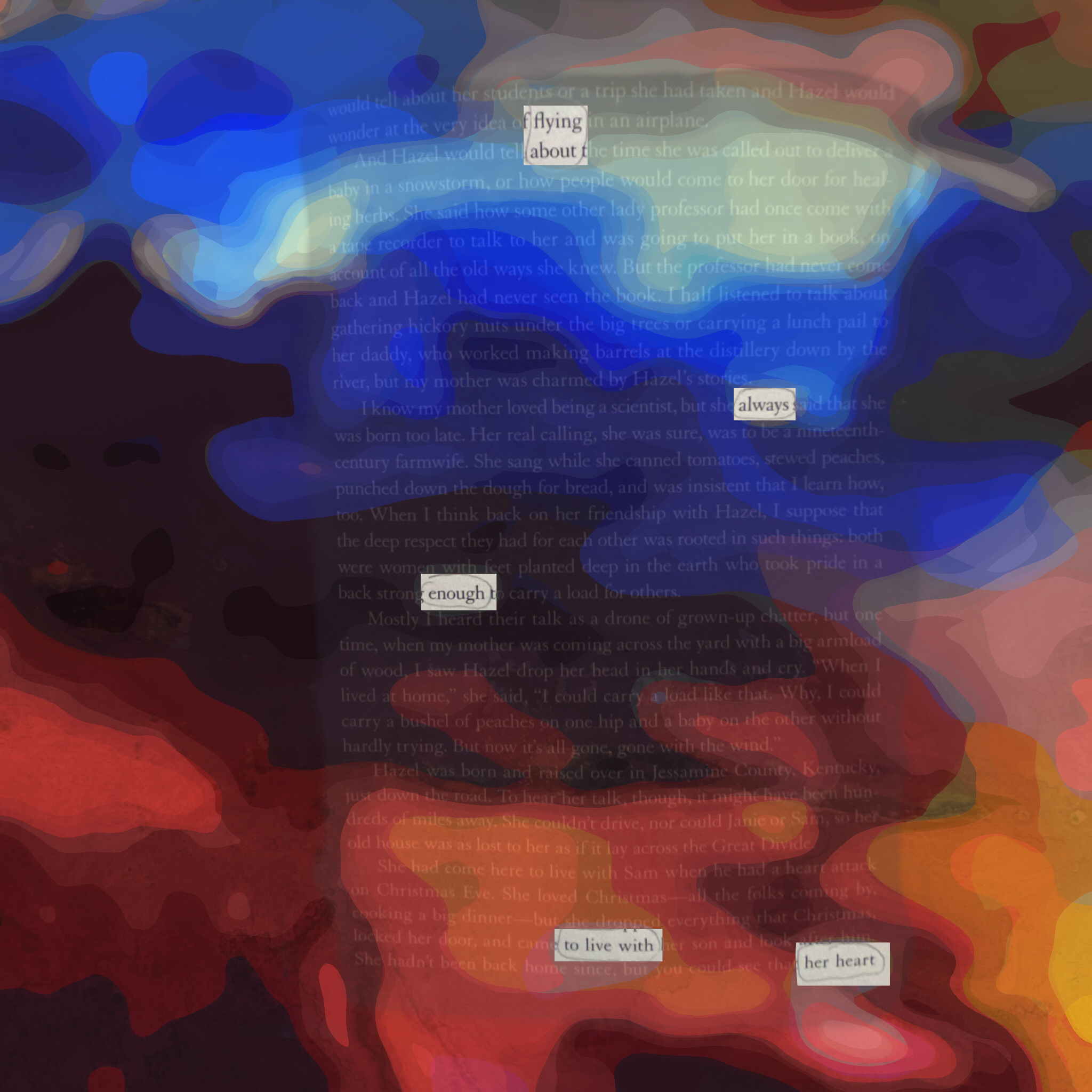 erasure (blackout) poetry, page 75, Braiding Sweetgrass, by Robin Wall Kimmerer, words collected by BSP on 3/24/21